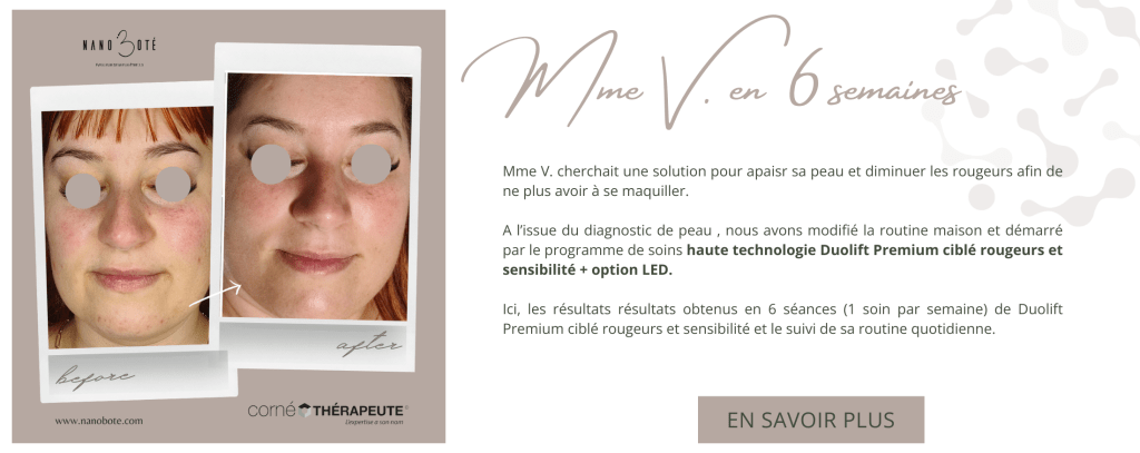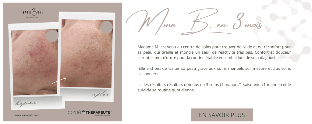 Découvrez ci-dessous, quelques résultats obtenus grâce à cette approche. Veuillez noter cependant que toutes les problématiques ne sont pas présentées comme par exemple peau grasse, déshydratée, sécheresse sans rougeurs etc…car elles sont difficilement visibles en photo mais font partie des problématiques fréquemment prises en charge.